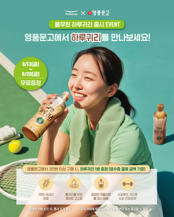 ‘책과 함께 귀리차 한 잔의 여유’를 콘셉트로 기획된 이번 이벤트에서는 도서, 문구, 음반, 디지털 상품 등 매장 내 전 품목을 포함해 3만원 이상 구매한 고객에게 풀무원샘물의 신제품 ‘하루귀리’ 1병을 사은품으로 증정한다. 영풍문고는 조용하고 쾌적한 매장 환경에서 쇼핑을 즐긴 뒤 건강한 귀리 음료와 함께 소소한 힐링의 시간을 제공한다는 계획이다.