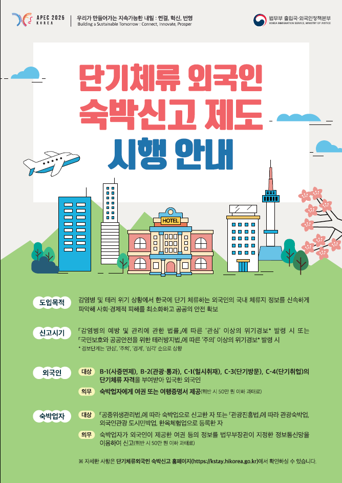 정성호 법무부 장관은 “숙박신고제 시행으로 외국인 관광객과 숙박업계의 불편이 예상되지만, APEC 정상회의 기간 중 각국 정상과 외국인 방문객, 국민의 안전을 지키기 위한 불가피한 조치”라며 “방문 외국인과 숙박업계의 적극적인 협조를 부탁드린다”고 밝혔다.
