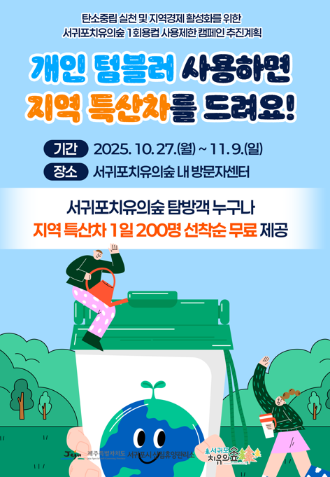 행사는 서귀포치유의숲 방문자센터에서 하루 선착순 200명을 대상으로 운영된다. 참여자는 개인 텀블러 사용을 통해 일회용컵 사용 절감의 의미를 체험하고, 숲속 산림치유 프로그램과 함께 환경보호의 가치를 느낄 수 있다.