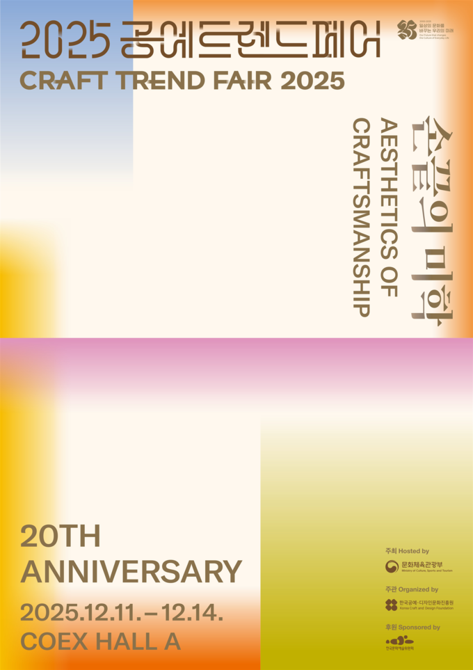 문화체육관광부와 한국공예·디자인문화진흥원은 12월 11일부터 14일까지 서울 코엑스에서 손끝의 미학을 주제로 2025 공예트렌드페어를 개최한다. 개막식은 11일 오후 5시에 진행되며, 행사와 함께 올해의 공예상 시상식도 열린다. 올해의 공예상은 창작 부문 오화진 작가, 이론 부문 강재영 전시기획자가 선정됐다.