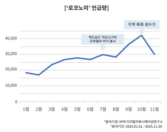 종합커뮤니케이션그룹 KPR 부설 KPR 디지털커뮤니케이션연구소가 약 4만 건의 소셜 빅데이터를 분석한 결과 올해 들어 로코노미 관련 키워드 언급량이 크게 증가한 것으로 나타났다. 올해 1월 1만8천여 건 수준이던 언급량은 점차 늘어나 10월에는 4만2천여 건을 기록하며 두 배 이상 증가했다. 특히 가을철 각 지자체가 기획한 축제와 로컬 여행 수요가 맞물리며 관심이 집중된 것으로 분석된다.