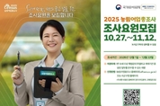 서귀포시는 오는 11월 14일까지 ‘2025 농림어업총조사’에 참여할 조사요원을 모집하고 있다고 밝혔다. 이번 조사는 농가·어가·임가 등 농림어업 전반의 실태를 파악해 국가 정책 수립과 행정 운영에 활용되는 5년 주기의 국가 통계조사로, 2025년 조사는 대한민국 센서스 100주년을 기념해 더욱 의미 있는 조사로 진행된다. 모집 인원은 총 200명으로, ▲총관리자 1명 ▲조사지원담당자 4명 ▲조사관리자 20명 ▲조사원 175명이다. 지원 자격은 만 18세 이상 서귀포시 거주자로, 조사 업무에 성실히 참여할 수 있는 시민이라면 누구나 가능하다. 지역 현황을 잘 알고 원활한 의사소통이 가능한 지원자는 우대한다. 접수 기간은 모집 직군에 따라 다르다. 총관리자·조사지원담당자·조사관리자는 10월 28일부터 11월 7일까지, 조사원은 10월 28일부터 11월 14일까지 접수를 받는다. 지원은 농림어업총조사 공식 홈페이지에서 지원서 양식을 내려받아 온라인으로 제출하거나, 서귀포시청 총무과 기록물통계팀을 방문해 서면으로 접수할 수 있다. 자세한 모집 요건과 제출 서류 등은 서귀포시청 누리집 채용공고에서 확인할 수 있다. 서귀포시 관계자는 “2025 농림어업총조사는 우리나