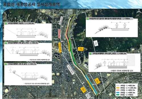 우선 중랑천 우안 산책로를 하천 쪽으로 배치해 하천을 조망하면서 걸을 수 있도록 개선하고, 산책로 단절 구간은 연결하고 좁은 구간은 확장해 산책로의 질을 높여나갈 계획이다.