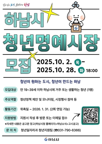 하남시(시장 이현재)가 청년의 시선으로 시정을 함께 만들어갈 ‘청년명예시장’을 오는 10월 28일까지 공개 모집한다. 이번 모집은 현 청년명예시장의 사임에 따른 후임 선발로, 새로 위촉되는 청년명예시장은 2026년 1월 31일까지 임기를 수행하며 최대 2회 연임이 가능하다.