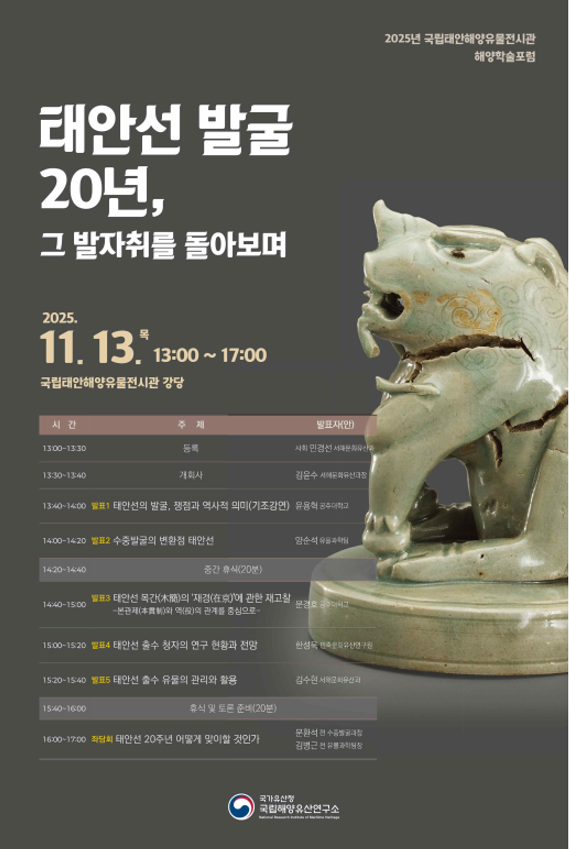 한국 수중고고학의 역사적 출발점인 태안선 발굴의 의의를 되새기며, 미래 해양유산 연구의 방향을 제시하는 자리가 될 것으로 기대된다.