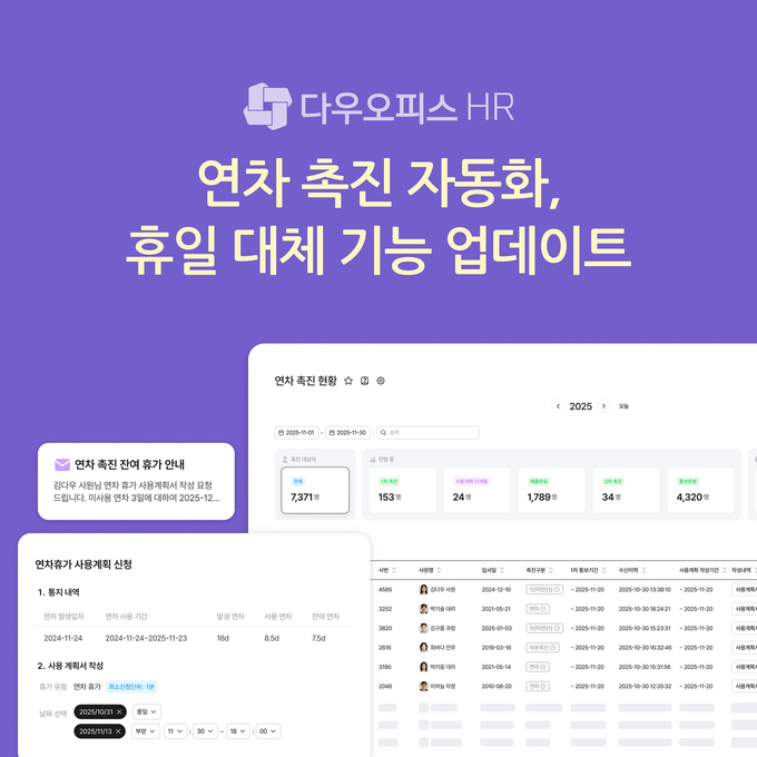 연차 촉진 자동화 기능도 인사 실무에서 높은 활용성을 보일 것으로 예상된다. 근로기준법에 따른 연차 사용 촉진 절차를 시스템이 자동으로 처리해 대상자 선정, 통보, 계획서 제출 등 필요한 과정을 모두 지원한다. 대시보드에서는 연차 촉진 진행 상황이 직관적으로 제공되어 인사 담당자가 클릭 몇 번으로 전체 절차를 관리할 수 있다. 이는 연차 미사용에 따른 분쟁 가능성을 줄이는 데 실질적인 도움을 준다.