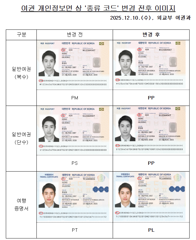 변경 내용에 따르면 일반여권에 사용되던 기존 PM 복수여권과 PS 단수여권 표기는 사라지고, 모든 일반여권이 PP 코드로 일원화된다. 여행증명서의 경우 지금까지 사용된 PT 코드가 폐지되고 앞으로는 PL 코드가 적용된다. 이는 ICAO가 권고한 국제 표기 방식에 맞춰 우리나라 문서 체계를 정비하는 과정의 일환이다.